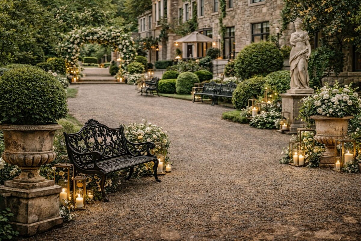 The outdoor spaces of a wedding hotel — the arrival driveway, the terrace for drinks receptions, the formal garden for photographs — are as important as anything inside. Cast iron garden benches, stone urns, cast iron planters, garden furniture and stone ornaments give hotel grounds a settled, heritage feel that takes years to achieve with new landscaping but can be created immediately with the right pieces.