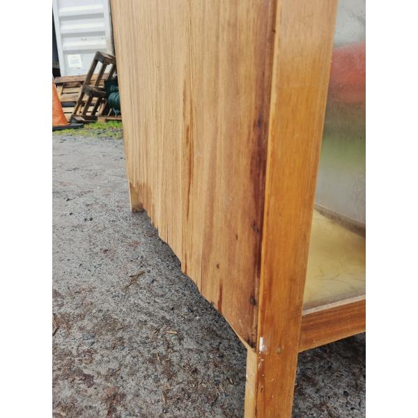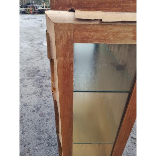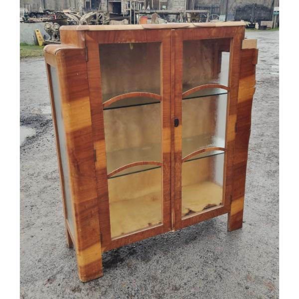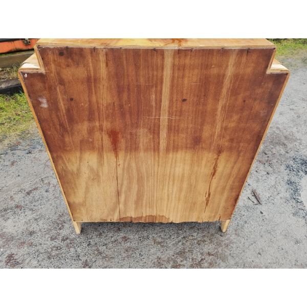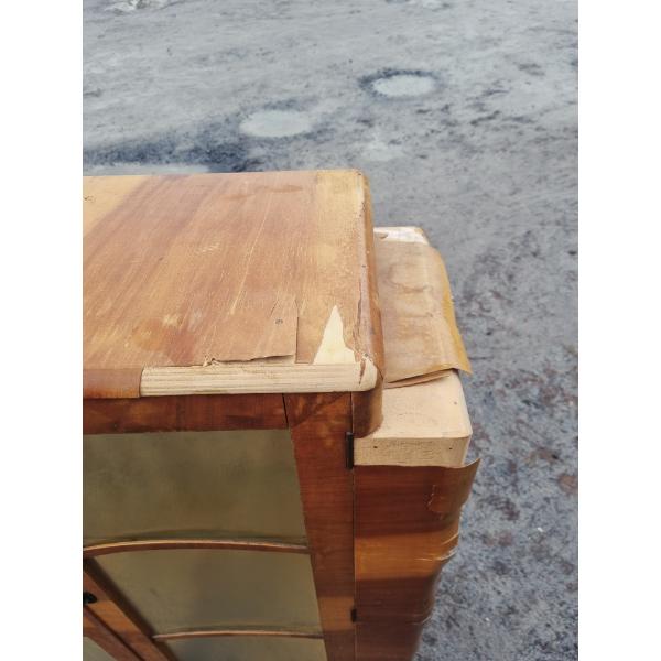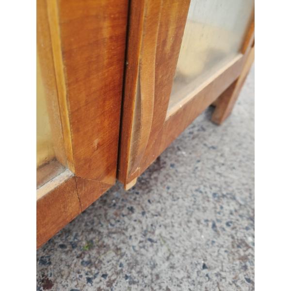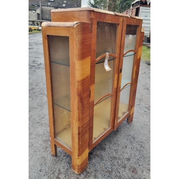 Add a touch of vintage elegance to your space with this Art Deco Display Cabinet. Featuring a two-door design, it offers an elegant way to showcase your most treasured items. While the unit shows some character from its age, including veneer lifting and minor marks on the top, it remains a striking example of Art Deco craftsmanship. The doors open easily, providing access to display your collectibles or fine china, but please note, it does not come with keys.